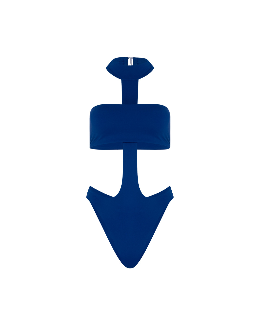 In timeless navy, it features daring side cutouts and a low-rise design that oozes confidence. The halter neck, complete with a chic choker, adds a touch of drama, fastening effortlessly at the back with a sleek swan hook closure.